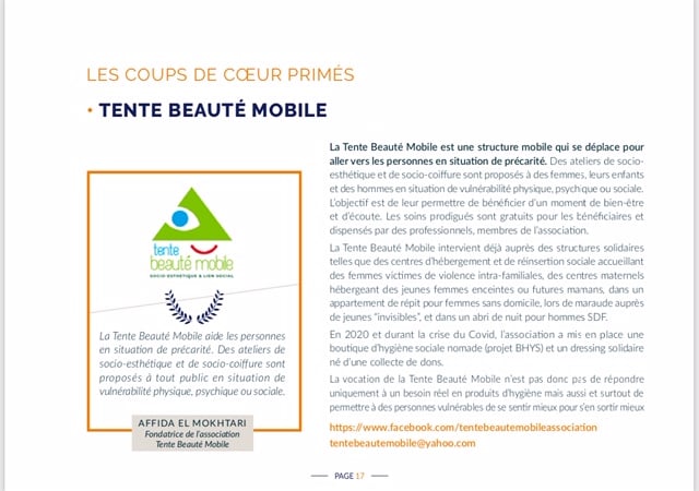 Lors de la cérémonie, 5 associations « Coups de Coeur » ont été primées : Femmes Debout (Dole), Les Bagageries Solidaires 92 (Clichy), Le Camion Douche (Toulouse), MaMaMa (Paris) et Tente Beauté Mobile (Besançon).